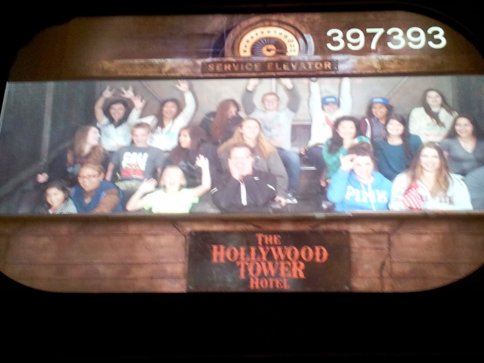 We went on all of the good rides in Disneyland before we ventured to California Adventure theme park. Spencer insisted we go on Tower of Terror. I caved and agreed to go. We waited for a long time to find out that the elevator we were supposed to go on broke. We waited some more and then before I knew it, it was too late to say "I need to pee" or "I am not feeling up to this ride" or anything to get me out. Going into this ride, I thought I would be safe and not really see how high we were. My husband totally had me convinced that we wouldn't see anything, we would just be inside an elevator. For the most part that was true. We shot up and watched the fake elevator drop. I am pretty sure I swore when we dropped a million miles an hour and shot back up. Suddenly the doors shot open and sure enough we could see out. I freaked out. Literally. I needed to get off. However I have never laughed so hard in my life. Notice in the picture below I am not looking and my hands are tightly wrapped around the handle bars. (I am in the back next to my crazy arm-waving-husband)